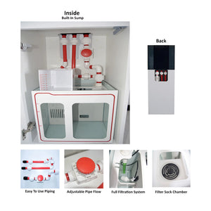 - CORAL SUMP: Your aquarium arrives with a sump system perfect for optimally filtering your coral reef tank. System includes a filter sock unit, protein skimmer/general use section, a top off reservoir, a section fit for your own choosing, and return pump section.