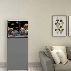 - INCLUDED IN PURCHASE: Your all-in-one purchase ships complete with one 24-gallon tank, one prebuilt and fully assembled matte finish cabinet, one built-in 13-gallon sump-filtration system, and easy to install pipes for your aquarium plumbing.