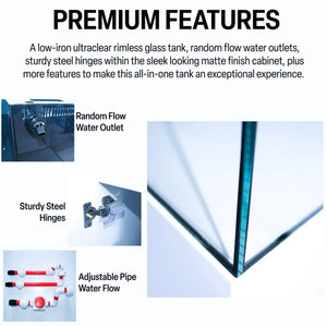 This complete all-in-one system supports coral reef saltwater aquariums, or it can be utilized as a freshwater fishtank! The low-iron glass is both rimless and seamless and offers a sleek, modern design that looks great at home or in the office. The tank is wide enough to provide ample aquatic landscaping options. Multiple sump compartments optimize ease of use, and all pipes ship. The random-flow return pump outlet allows for superior water distribution as water flows from sump to tank. The adjustable water return pipe gives you complete control over your tank’s needs. This is the perfect base for your ideal aquarium!