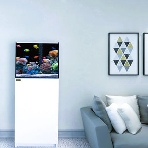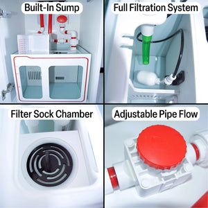 - CORAL SUMP: Your aquarium arrives with a sump system perfect for optimally filtering your coral reef tank. System includes a filter sock unit, protein skimmer/general use section, a top off reservoir, a section fit for your own choosing, and return pump section.