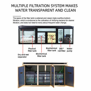- Inner size of filtration system sink(inches):39 (L) x 9.9 (W) x 12.6 (H), Water Actual Capacity: 22 Gallons. Fish tank All glass is bonded by German original ultra-long-lasting biophilic silica gel, which can resist saltwater erosion for up to 20 years.