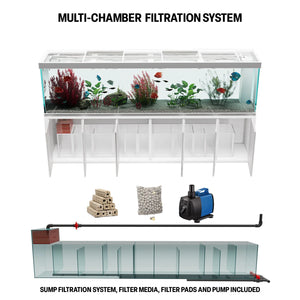 The premium aluminum frame prevents deformation and fading and also comes with a tri-color LED-equipped cover. The cabinet frame is also resistant to tension and torque deformation which can be caused by heavy loads as well as being corrosion resistant. The cabinet houses the sump filtration system, which will include all the pieces needed for installation, as well as a submersible aquatic pump. The sump filtration system includes a wet-dry filtration system as well as designated filter media dividers. This will allow for a modular approach when handling the filter media of your choice.