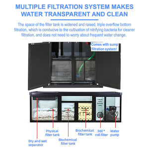 The premium aluminum frame prevents deformation and fading and also comes with a tri-color LED-equipped cover. The cabinet frame is also resistant to tension and torque deformation which can be caused by heavy loads as well as being corrosion resistant. The cabinet houses the sump filtration system, which will include all pieces needed for installation, as well as a submersible aquatic pump. The sump filtration system includes a wet-dry filtration system as well as designated filter media dividers. This will allow for a modular approach when handling the filter media of your choice.