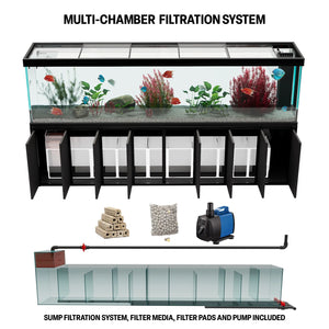 The premium aluminum frame prevents deformation and fading, and also comes with a tri-color LED-equipped cover. The cabinet frame is also resistant to tension and torque deformation which can be caused by heavy loads as well as being corrosion resistant. The cabinet houses the sump filtration system, which will include all pieces needed for installation, as well as a submersible aquatic pump. The sump filtration system includes a wet-dry filtration system as well as designated filter media dividers. This will allow for a modular approach when handling the filter media of your choice.