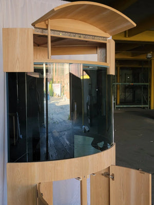 Each Aqua Vim aquarium is made with 100% clear glass using our proprietary glass bending technique, and paired with elegantly handcrafted wood cabinetry.