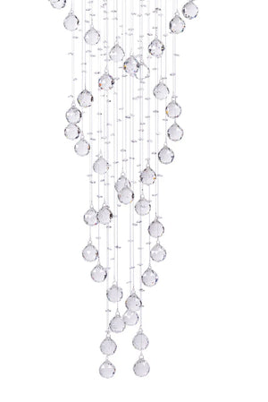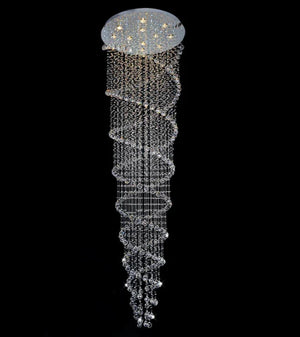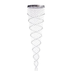 Finesse Decor presents the beautiful Double Helix Chandelier with a flow of crystals detailing down 110 inches for a very opulent aesthetic look. This extravagant chandelier is adorned by mass crystals in a spiral formation. Accompanied by a chrome canopy and 12 GU10 LED bulbs that are included. This chandelier will be a perfect elegant accessory to any high ceiling eating space, foyer, staircase or even a modern living room.