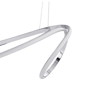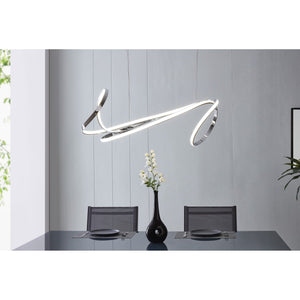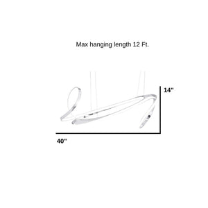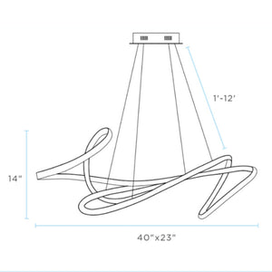 This curvy and smooth chandelier has an actual size of 40 inches long by 23 inches wide by 14 inches tall. This chandelier can go above any space and provide you with the right amount of coverage with it's adjustable hanging wires, it has a maximum hanging length of 10 feet and can go as short as 12 inches from your ceiling and weighs 10 pounds. This fixture comes with a rectangular canopy that measures 7"W by 5"L and 1.5"in height. The fixture also has adjustable wires so that you can shorten or lengthen the measurement according to your needs, Since each wire is independently adjustable, you can use this fixture in a sloped ceiling by having a shorter wire and a longer one.