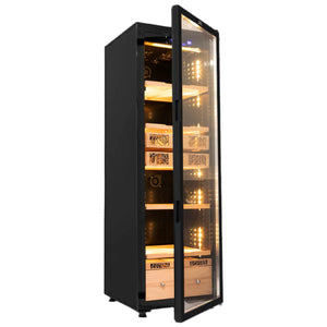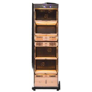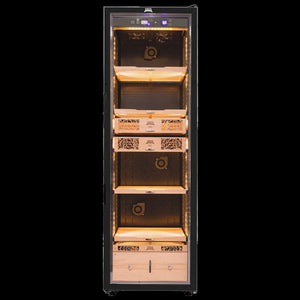 Humidor Supreme® Electronic Humidor has a storage capacity of 2,000 to 2,500 cigars and the dimensions are 22.4"w x 27" d x 75.6h". Available in black the humidor features a digital control panel displaying temperature and humidity. It's easy to install, set up, and maintain.