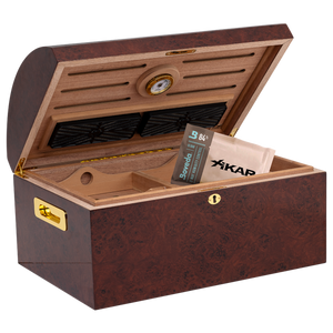 The Treasure Dome Desktop Humidor is lined with premium kiln-dried Spanish cedar, features the SureSeal® Technology to ensure proper lid seal-on closure to protect and preserve your cigars, and has been measured to reflect true cigar storage capacity.