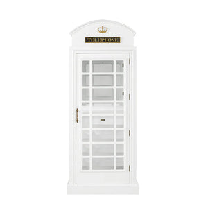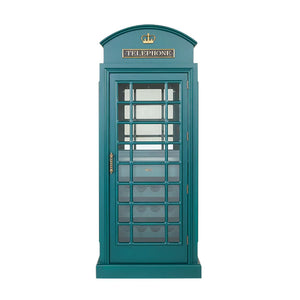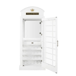This classic English phone booth bar cabinet brings a touch of vintage charm and sophistication to any space. The upper compartment features a mirror, adding a timeless bar aesthetic that enhances the overall look. Equipped with a convenient storage drawer and a built-in wine rack, it offers ample space for organizing your bar essentials. The cabinet is also complete with internal lighting, creating an inviting ambiance that beautifully showcases your collection and makes entertaining even more stylish.