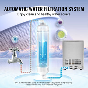 - Make Cleaning a Breeze: Our ice machine comes with a one-touch self-cleaning function and a supplied water filter in the inlet pipe. Say goodbye to worries about impurities in your ice. Our state-of-the-art filtration system removes any unwanted particles, ensuring that only pure, clean water is used. It's not just ice - it's ice you can trust!
